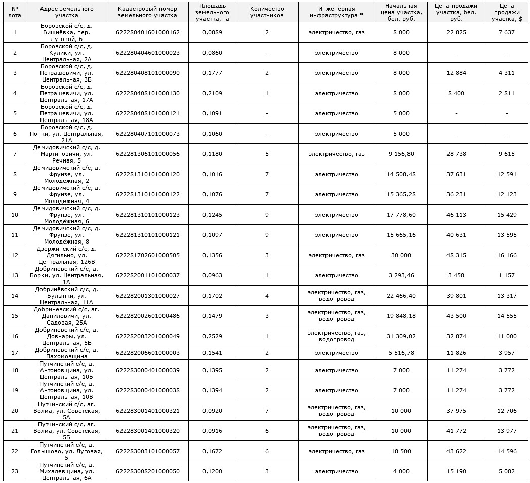 Источник материала: realt.by Сегодня состоялся аукцион по продаже земельных участков в частную собственность граждан Беларуси для строительства жилых домов в Дзержинском районе. Участникам было предложено 24 лота. Рассказываем об итогах торгов. Участки на аукцион выставляли Боровской сельсовет (6), Демидовичский (5), Дзержинский (1), Добриневский (5) и Путчинский сельсовет (7). В Боровском сельсовете торги прошли по 2 лотам. Участки расположены в д. Вишневка в пер. Луговом, 6, и д. Петрашевичи на ул. Центральной, 3 Б. На земельные наделы претендовали по 2 человека. Площадь участка в Вишневке составляет 8,84 сотки. Он оснащен электричеством и газом и был выставлен на аукцион за 8 000 рублей. Лот продали за 22 825 рублей, или 7 637 долларов по курсу Нацбанка на день проведения аукциона. Участок в д. Петрашевичи насчитывает 17,77 сотки, оснащен электричеством и также был выставлен на аукцион за 8 000 рублей. Лот продали за 12 884 рубля, или 4 311 долларов. На один участок в Боровском сельсовете подали одно заявление. На 3 лота заявок не поступило. В Демидовичском сельсовете торги прошли по всем участкам. На них претендовали от 5 до 9 заявителей. По 9 заявок подали на участки в д. Фрунзе на ул. Молодежной, 6, и ул. Молодежной, 8. Наделы оснащены только электричеством. Участок на ул. Молодежной, 6, насчитывает 12,45 сотки. При стартовой цене 17 778 рублей его удалось продать за 46 113 рублей, или 15 429 долларов. Площадь участка на ул. Молодежной, 8, составляет 11 соток. При начальной цене 15 665 рублей его продали за 40 631 рубль, или 13 595 долларов. В Дзержинском сельсовете участок находится в д. Дягильно на ул. Центральной, 126 В. На него претендовали 3 человека. Земельный надел насчитывает 13,56 сотки, оснащен электричеством и газом. При стартовой цене 30 000 рублей лот реализовали за 48 315 рублей, или 16 166 долларов. В Добриневском сельсовете торги прошли по 3 лотам. На них претендовали от 2 до 4 человек. Наибольшее количество заявок – 4 - подали на участок в д. Булынки на ул. Центральной, 11 А. Площадь земельного надела составляет 17 соток. Он оснащен электричеством, газом и водой. При стартовой цене 22 466 рублей лот продали за 39 801 рубль, или 13 317 долларов. В Путчинском сельсовете торги прошли по всем 7 лотам. На участки претендовали от 2 до 7 человек. За 10 000 рублей каждый были предложены участки в аг. Волма на ул. Советская, 5 А, и ул. Советской, 5 Б. Земельные наделы насчитывают по 9 соток и оснащены электричеством, газом и водопроводом. На участок на ул. Советской, 5 А, подали 7 заявок. Организатором аукциона выступил Минский областной центр инвестиций и приватизации. Чтобы разместить новость на сайте или в блоге скопируйте код: