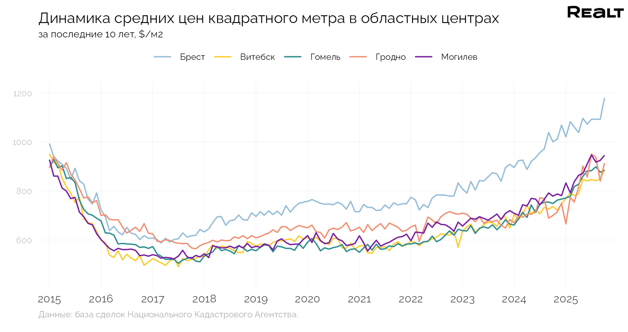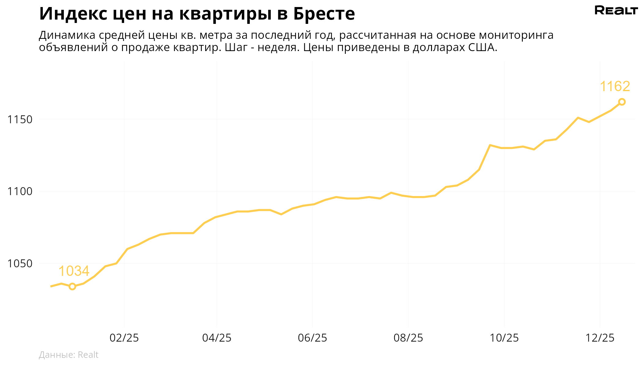 Источник материала: realt.by В кварталах между проспектом Машерова, улицами Советской, Дзержинского и Куйбышева в центре Бреста — малоэтажная историческая застройка со своим особым настроением. Здесь тихо и в то же время оживленно, много зелени и при этом достаточно инфраструктуры. Именно в этой локации компания «АйронИнвестПроект» построила 5-этажный . Монолитно-каркасный объект идеально вписался в окружающую среду. Мы изучили комплекс снаружи и изнутри, рассмотрели планировки и узнали цены. Недвижимость в Бресте: рост цен за год — 12,6%Для начала изучим ситуацию на рынке недвижимости Бреста. Согласно за неделю 8-15 декабря 2025 года, средняя цена в объявлениях о продаже квартир в самом городе и области выросла на 0,5% и составила 1 162 долларов за квадратный метр (здесь и далее: стоимость в долларах указана в эквиваленте, все расчеты — в белорусских рублях по курсу Национального Банка Республики Беларусь). За год рост составил 12,6%. И это данные по всей области, в которых учтены и райцентры, и сельские населенные пункты; и старый жилфонд, и новостройки. Почему недвижимость в Бресте выбирают для инвестиций?Отмечается высокий спрос как на большие квартиры, так и на компактные однушки и студии. С чем это связано? Брест — туристический магнит для белорусов и иностранных туристов. Сюда приезжают, чтобы посетить:
