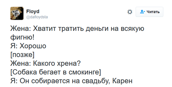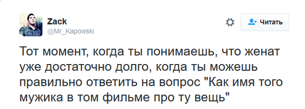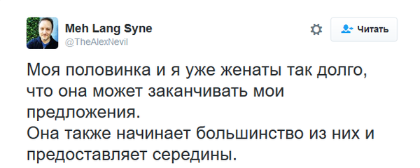 Фактрум предлагает читателю лучшие твиты об отношениях, в которых супруги проявляют недюжинное терпение и искромётное чувство юмора! Чтобы разместить новость на сайте или в блоге скопируйте код: