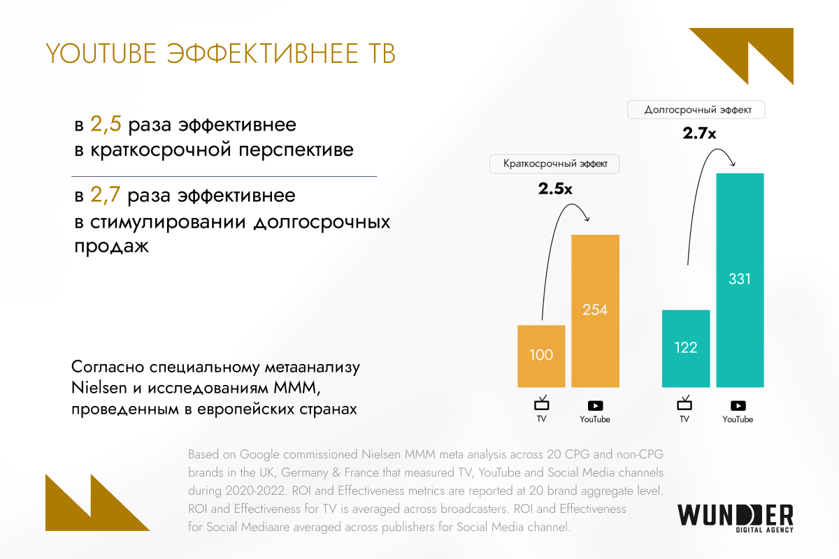 Для бренда это значит, что если его нет на YouTube, он исчезает из поля зрения значительной части аудитории. Youtube работает вдолгую: создает спрос — прокачивает поиск — приносит продажи. Нельзя оценивать эффективность по кликамПрисутствие на YouTube — это не просто расширение охвата. Это стратегический инструмент, который работает по принципу «брендинг стимулирует поиск, а поиск увеличивает долю рынка». Уже в первый месяц после запуска брендовой кампании можно увидеть рост запросов о бренде, а эффект сохраняется до двух лет.