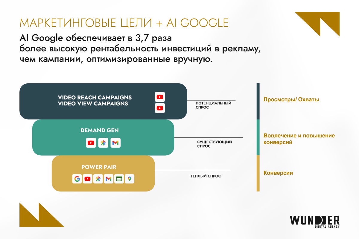 Youtube работает вдолгую: создает спрос — прокачивает поиск — приносит продажи. Нельзя оценивать эффективность по кликам. AI как дополнительный драйвер эффективностиСегодня YouTube усиливает свои позиции не только за счет аудитории, но и благодаря технологиям. Google создал AI-инструмент, который использует все способы медиапотребления и сквозным методом работает на протяжении всей воронки. С его помощью бизнес, задействуя YouTube, может решать задачи на каждом этапе воронки. Алгоритмы Google позволяют запускать AI-кампании, которые дают в несколько раз более высокий ROI по сравнению с ручной оптимизацией. Это позволяет совмещать широкий охват и глубокую персонализацию, управляя результатами через автоматизацию. Платформа закрывает все этапы воронки — от формирования спроса до конверсии. Google предлагает отдельные инструменты под каждую задачу: